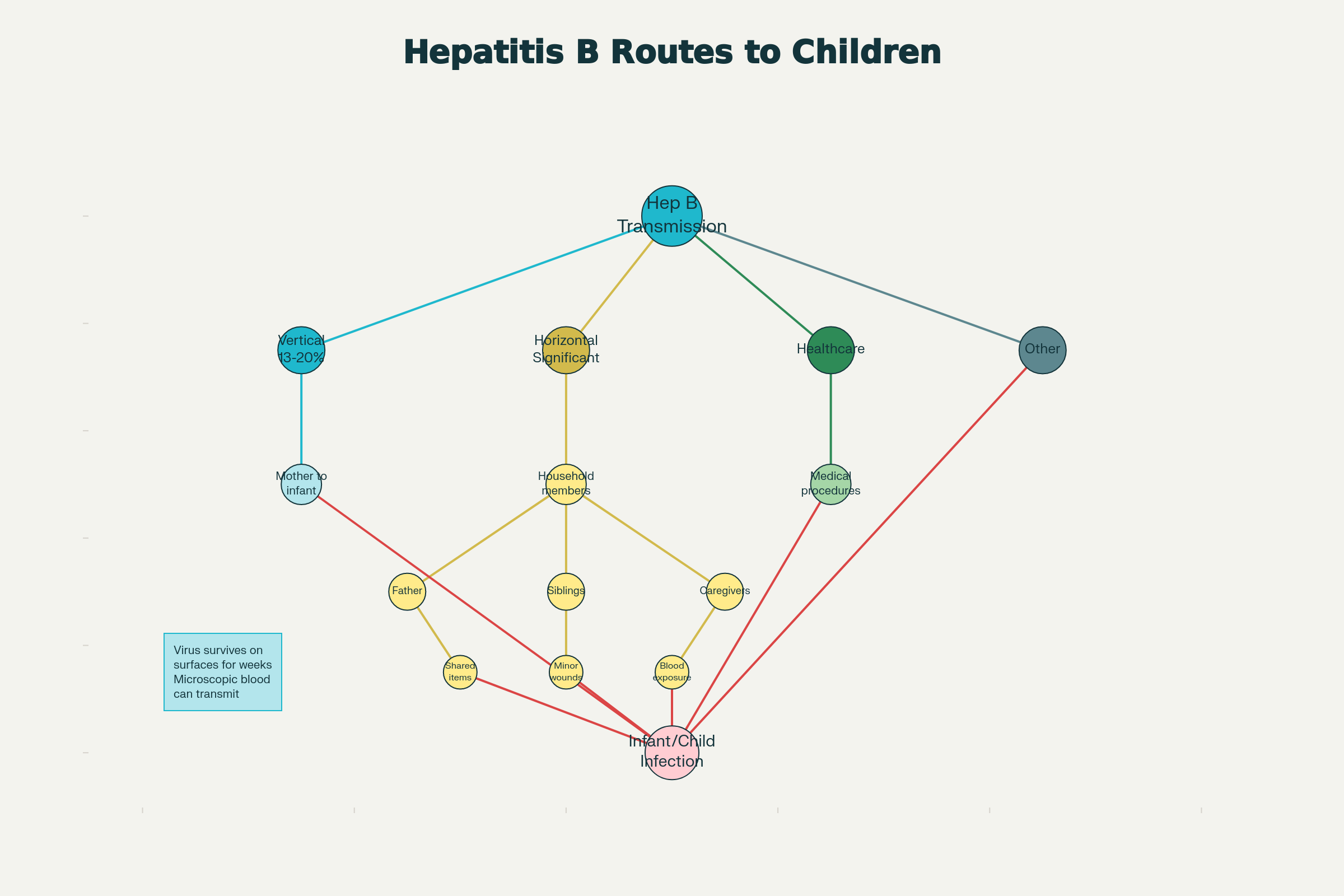 Horizontal transmission—infection acquired from household contacts, caregivers, or other children—represents a significant and often-overlooked route of HBV acquisition during early childhood.